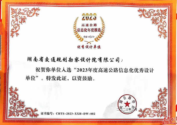 湖南日報·華聲在線4月21日訊(通訊員 薛新風)近日,第25屆中國高速公路信息化大會暨技術產品博覽會在福州舉辦。大會舉行了“2023高速公路信息化年度推選活動”揭曉典禮。這是當前我國交通信息化領域最高榮譽的獎項評選,湖南建投交通設計院獲“優秀設計單位”表彰,是本次評選中湖南省唯一獲該類別榮譽的企業。